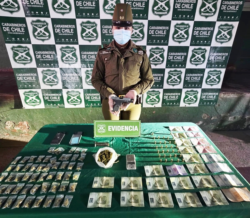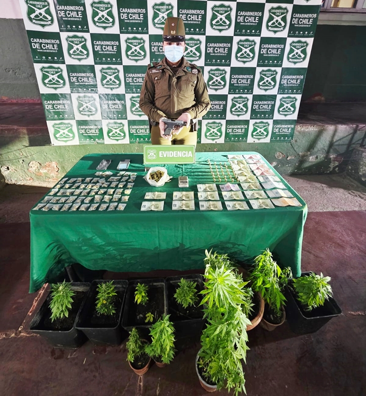 Posteriormente hallaron al interior de la casa una pistola con su número de serie borrado y un cargador con 12 cartuchos calibre 3.80, además de otras 20 municiones del mismo calibre, 11 plantas de marihuana, 152 gramos de cannabis sativa lista para su venta, además de elementos para la dosificación de sustancias ilícitas.