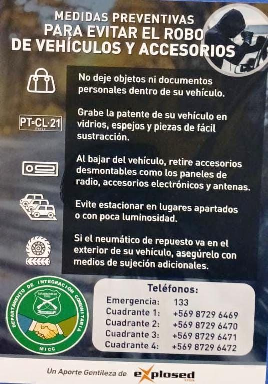 Igualmente, se insta a la comunidad que en caso de sorprender a algún sujeto sustrayendo especies desde el interior de vehículos estacionados, dar de inmediato aviso al nivel de emergencia 133, al celular del Cuadrante 1 (+56987296469) o al personal en patrullaje.
