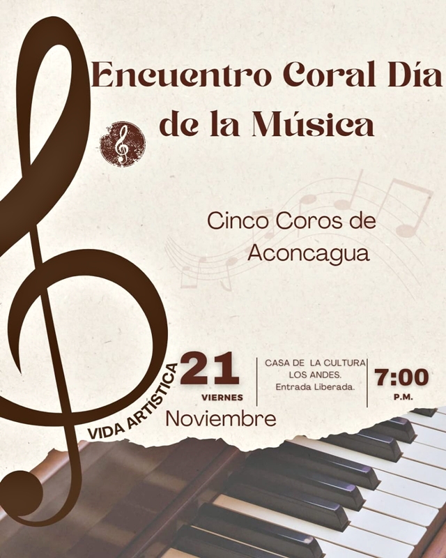 El viernes 21, también a las 19:00 horas, se realizará el Encuentro Coral Día de la Música, con la presentación de cinco agrupaciones del Valle de Aconcagua que deleitarán con sus bellas voces, como son el Coro de Profesores Luis Navarrete Vera, el Coro de Adulto Mayor de San Felipe, la Camerata Aconcagua, el Coro de Adulto Mayor Alegres Voces Andinas y el Coro del Hospital San Juan de Dios de Los Andes.