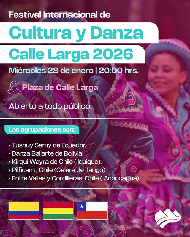 CALLE LARGA (28/01/2026).- La 8ª versión del Festival Internacional de Cultura y Danza de Calle Larga tendrá lugar este miércoles en el anfiteatro de Plaza de Armas de la comuna, evento que está programado comenzar a las 20:00 horas.