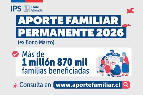 ACONCAGUA (21/02/2026).- El Instituto de Previsión Social, IPS, informó que a partir del 16 de febrero se inició el pago del Aporte Familiar Permanente 2026, ex “Bono Marzo”, al primer grupo de beneficiarias y beneficiarios. Esta primera nómina la componen personas que tenían concedido el Subsidio Familiar a diciembre de 2024 y también familias pertenecientes, a esa misma fecha, al Subsistema de Seguridades y Oportunidades (Ingreso Ético Familiar) o a Chile Solidario, y que a la vez cobran esos beneficios en forma regular en el IPS entre el 14 y 28 de febrero. El Aporte se les pagará en conjunto con su beneficio habitual, sin necesidad de nuevos trámites.