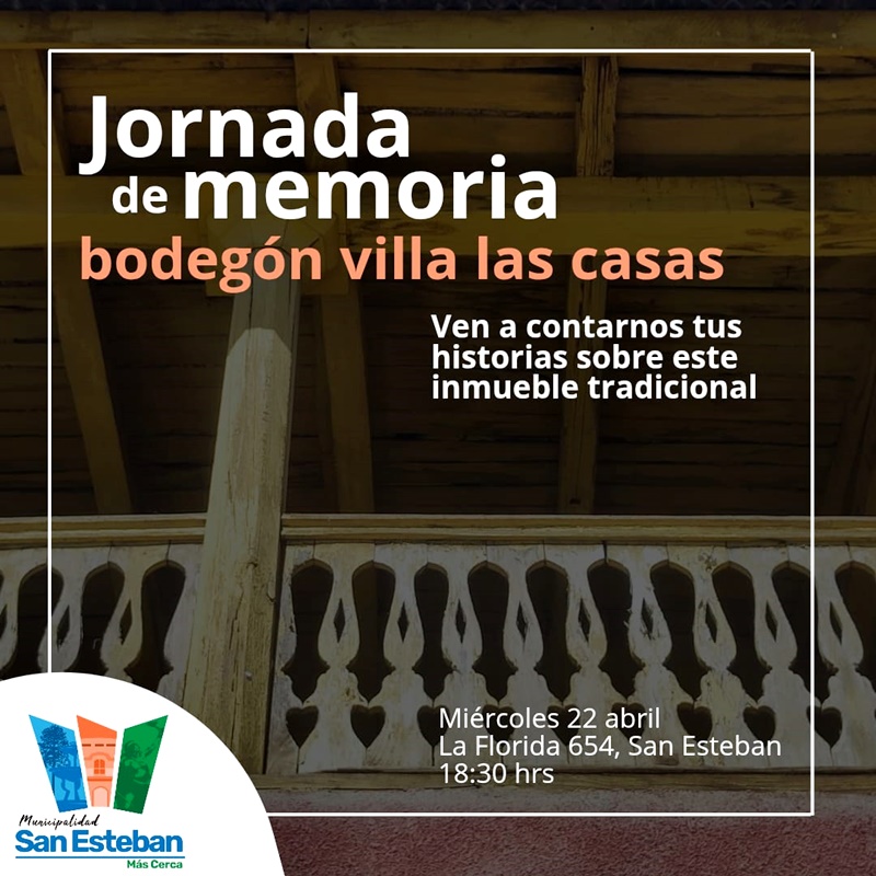 SAN ESTEBAN (21/04/2026).- Una “Jornada de Memoria” que tiene como objetivo rescatar y reconstruir la historia del Bodegón de Villa Las Casas, ubicado en avenida La Florida N° 654, se realizará este miércoles 22 de abril, a contar de las 18:30 horas, en el mismo inmueble.