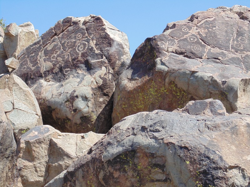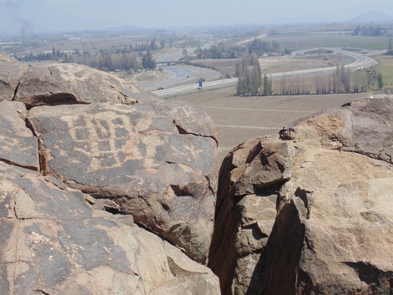 En su extremo sur, tanto en las prominencias de la cima como en sus laderas adyacentes, se encuentran bloques rocosos con petroglifos. Desde allí se tiene una amplia visión del valle y la cordillera.