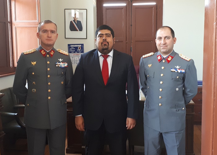 LOS ANDES (19/12/2017).- El gobernador provincial de Los Andes, Daniel Zamorano Vargas, se reunió con el nuevo director de la Escuela de Montaña del Ejército, Teniente Coronel Jorge Hinojosa Riquelme, acompañado del director saliente Coronel Humberto Julio Schweitzer.