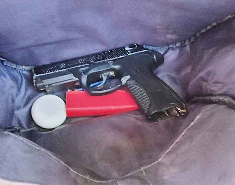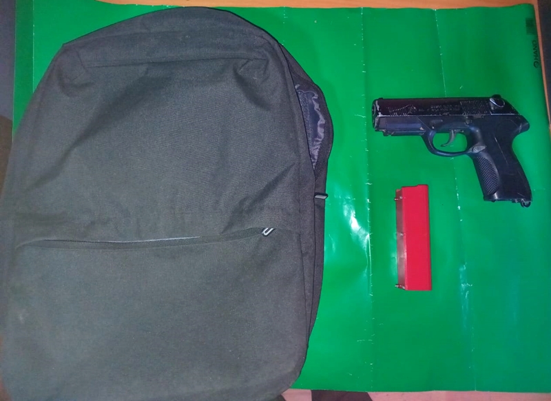 Cuando se acercaban los policías advirtieron que un objeto fue guardado en la mochila de uno de ellos, por lo que al momento de practicar el control de identidad y revisar el artículo hallaron en su interior una pistola marca Bruni modelo P4, de calibre 9 milímetros, la que al ser revisada se comprobó que había sido modificada.