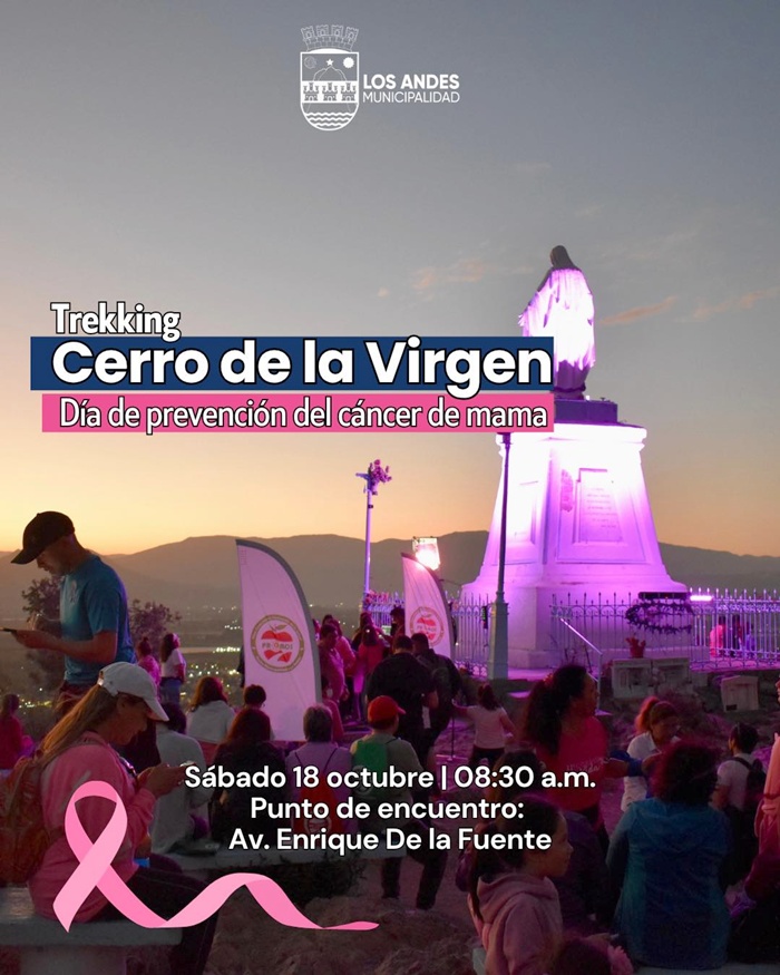 LOS ANDES (14/10/2025).- Este sábado 18 de octubre, la ciudad de Los Andes se sumará a la conmemoración del Día Mundial de la Lucha contra el Cáncer de Mama con la realización de un trekking temático en el Cerro de la Virgen. La actividad, que comenzará a las 08:30 horas, tiene como objetivo sensibilizar a la comunidad sobre la importancia de la prevención y el autocuidado de la salud femenina.