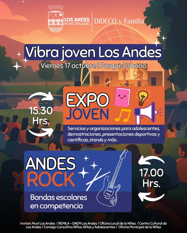 LOS ANDES (15/10/2025).- Este viernes 17 el sector del Anfiteatro del Parque Urbano Ambrosio O’Higgins se transformará en el epicentro del evento “Vibra joven Los Andes”, panorama dirigido y pensado para que los niños y jóvenes sean los verdaderos protagonistas.