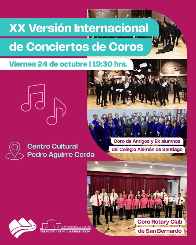 La segunda será a las 19:30 horas en el Centro Cultural y Museo Presidente Pedro Aguirre Cerda de Calle Larga, con la participación del Coro Rotary Club de San Bernardo y el Coro de Amigos y Exalumnos del Colegio Alemán de Santiago.