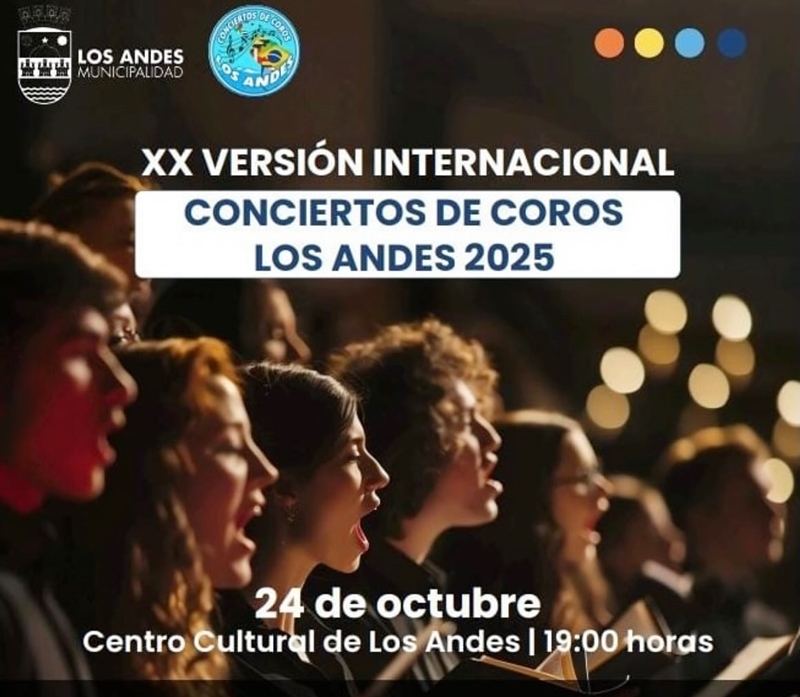 LOS ANDES (24/10/2025).- Este fin de semana la ciudad de Los Andes se convertirá en el epicentro coral del país al acoger y celebrar la vigésima versión internacional de Conciertos de Coros Los Andes-Chile 2025, evento que reunirá a diez destacadas agrupaciones vocales provenientes de Argentina, Colombia, Cuba y las anfitrionas de Chile.