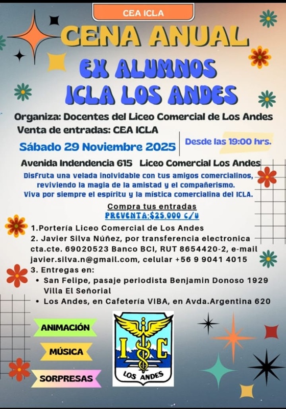 Para este sábado 29 de noviembre desde las 20:00 horas, se programó el gran Encuentro de ex Comercialinos (as), en dependencias del liceo, donde la comisión organizadora está trabajando a full para que el evento resulte inolvidable, con música en vivo, entretenida animación, sorpresas, y una rica cena; junto a la buena onda que produce el reencuentro con los compañeros de curso y los profesores que fueron referente en nuestra vida estudiantil. Entonces, la convocatoria es a participar de este encuentro y pasar un momento agradable en el querido Instituto Comercial de Los Andes.