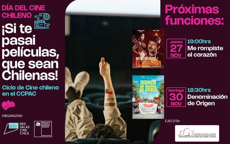 CALLE LARGA (27/11/2025).- Con motivo de la conmemoración este sábado 29 de noviembre del Día del Cine Chileno, dos películas serán exhibidas durante estos días en el Centro Cultural y Museo Presidente Pedro Aguirre Cerda en el sector de Pocuro.