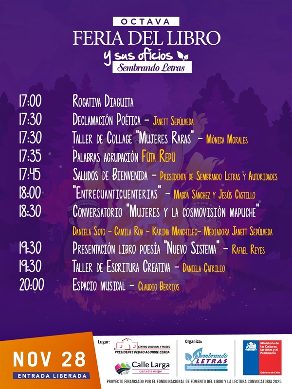 Como siempre se contará con stands de editoriales, escritores y oficios del libro, y dentro de las actividades habrá lanzamiento de nuevos libros de autores locales, conversatorios, cuentacuentos, títeres, talleres de cómic, collage, fotografía y quitapena. También habrá música en vivo con la presentación de bandas y cantautores del Valle de Aconcagua.