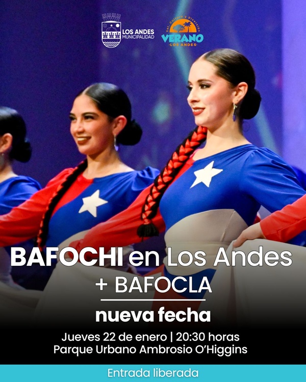 El jueves 22 de enero, a las 20:30 horas, el anfiteatro del Parque Urbano Ambrosio O’Higgins será el escenario para la esperada presentación del Ballet Folclórico de Chile (BAFOCHI) junto al elenco local BAFOCLA. Esta actividad fue reagendada para quienes no pudieron asistir a la función originalmente programada a comienzos de mes.