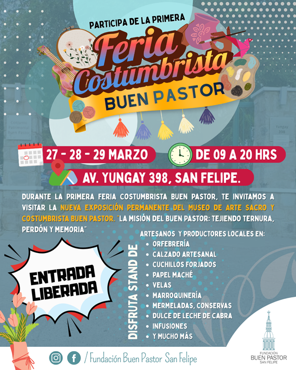 ACONCAGUA (18/03/2026).- Con una invitación abierta a toda la comunidad del Valle de Aconcagua, el Conjunto Patrimonial Buen Pastor se prepara para vivir la Primera Feria Costumbrista Buen Pastor, una iniciativa que busca poner en valor las tradiciones, la cultura y los oficios locales en un espacio patrimonial único en la ciudad.