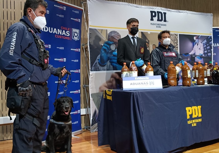La diligencia se llevó a cabo luego que un fiscalizador del Servicio Nacional de Aduanas detectara en el interior de la maleta de un pasajero de un bus que hacía ingreso Chile por el complejo Los Libertadores un total de 23 botellas con una sustancia líquida de color marrón.