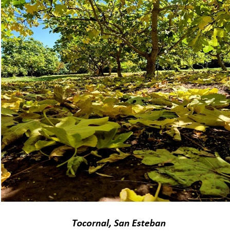 La foto que inspira la crónica, corresponde a una plantación de higueras, cubriendo totalmente el suelo con hojas secas doradas que el viento rápidamente resquebraja, haciendo pisos otoñales inigualables. El agua de riego de fines de marzo e inicios de abril resulta clave para inducir pequeñas yemas que se esconderán y abrigarán casi inexistemente a través del largo invierno, originando las brevas de mitad de diciembre. Sin duda una especie muy especial, pues carentes de hojas invernales son capaces de producir un segundo fruto en el año calendario. Higueras bíferas, dos frutos, varios misterios y hojas caídas.