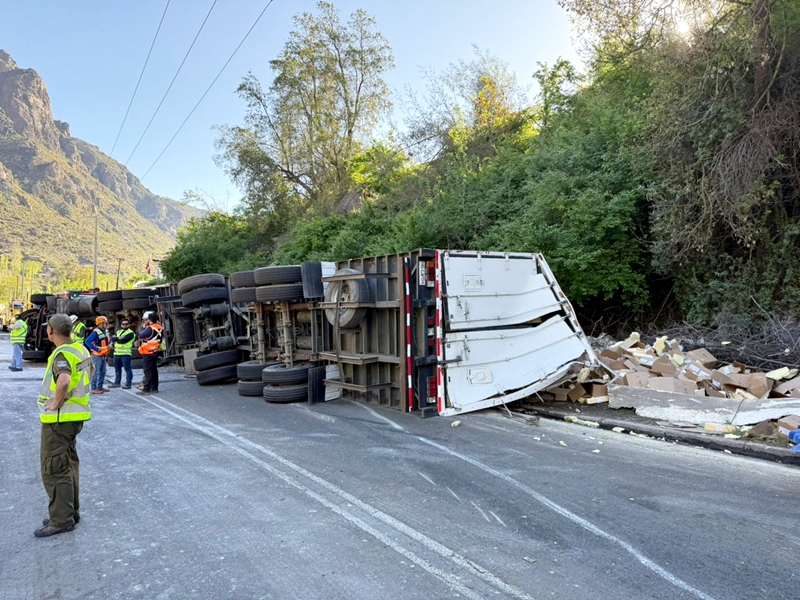 El camión prosiguió su marcha y varios metros más adelante tras enfrentar una curva volcó de costado sobre la calzada y berma frente a la Escuela de Montaña del Ejército en la localidad de Río Blanco, destruyéndose el container y quedando esparcido el cargamento.