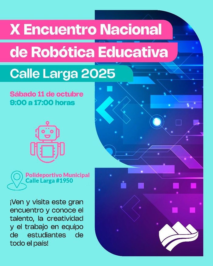 CALLE LARGA (09/10/2025).- Este sábado 11 de octubre, a partir de las 9:00 horas, el Polideportivo Municipal de Calle Larga será nuevamente sede del X Encuentro Nacional de Robótica Educativa, Calle Larga 2025, una instancia única que reunirá a estudiantes de distintas regiones del país en torno a la innovación, la tecnología y el trabajo colaborativo.