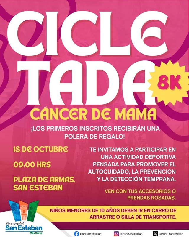 SAN ESTEBAN (13/10/2025).- En el marco de la conmemoración del Mes del Cáncer de Mama, el Departamento de Salud de San Esteban invita a toda la comunidad a participar en una cicletada familiar, que se realizará el sábado 18 de octubre desde las 09:00 horas. La convocatoria será frente la plaza de armas, a las afueras de la Escuela Básica Pablo Neruda, lugar desde donde se dará inicio al recorrido.