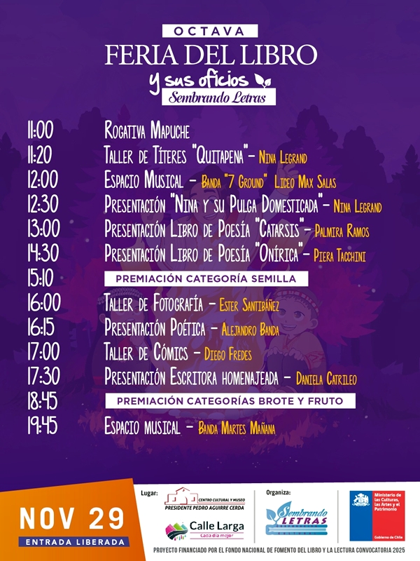 CALLE LARGA (28/11/2025).- La 8ª versión de la Feria del Libro y sus oficios se realiza este viernes 28 y sábado 29 de noviembre en el Centro Cultural y Museo Presidente Pedro Aguirre Cerda, en la localidad de Pocuro, con entrada gratuita.