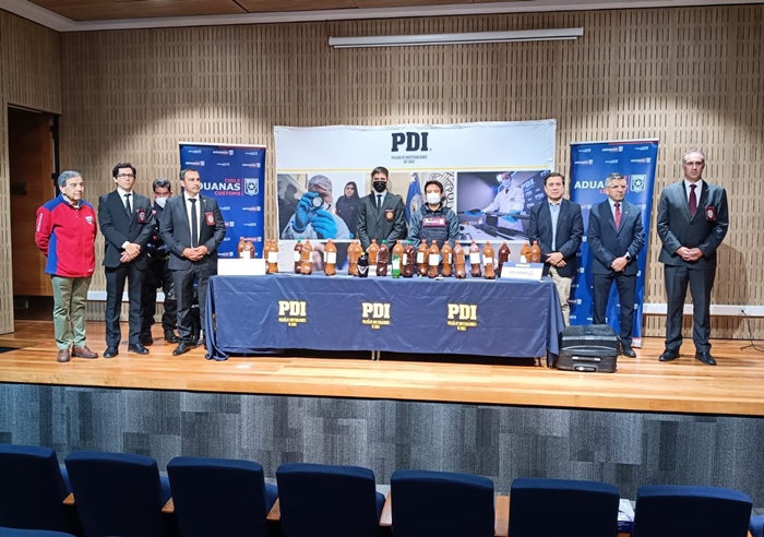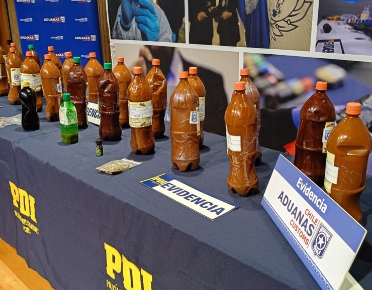 La diligencia se llevó a cabo luego que un fiscalizador del Servicio Nacional de Aduanas detectara en el interior de la maleta de un pasajero de un bus que hacía ingreso Chile por el complejo Los Libertadores un total de 23 botellas con una sustancia líquida de color marrón.