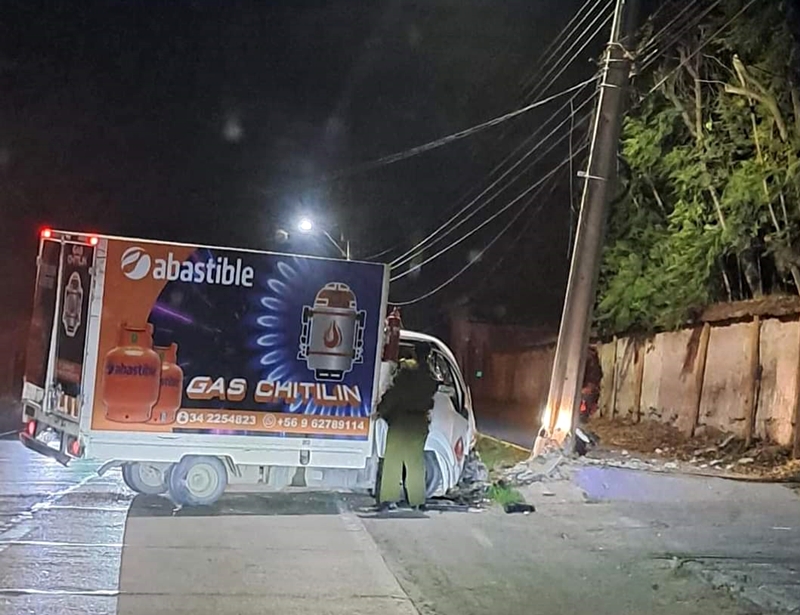 Por su parte, el segundo caso se produjo a eso de las 20:50 horas en el sector San Roque del camino troncal 601 (exruta CH-60), comuna de Panquehue, donde un camión de venta de gas licuado de la empresa Abastible se estrelló contra un poste del alumbrado público, el que fue destruido en su base y ante lo cual funcionarios de Chilquinta debieron realizar el corte de la energía eléctrica.