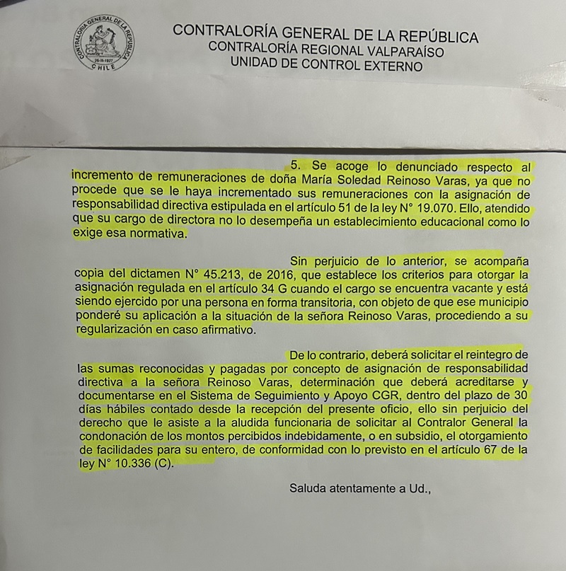 LOS ANDES (01/04/2024).- Con fecha 22 de Marzo de 2024 la Contraloría General de la Republica respondió a denuncia ingresada en Junio de 2023 por la Concejala Marianella Benavides acogiendo su aprehensión en relación a la procedencia del pago mensual por asignación prevista en Ley N° 19.070 a la directora del Departamento de Educación Municipal de Los Andes (DAEM) desde el mes de Marzo de 2023 hasta Febrero de 2024 por un monto equivalente a $813.780.