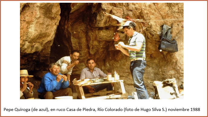 Recuerda a don Pepe Quiroga como “uno de los arrieros de palabra, muy ameno en sus conversaciones, incomparable en el relato de anécdotas, en fin, una muy buena persona”. Le resulta inolvidable la recepción en el Ruco de Piedra, en plena cordillera de Río Colorado, cuando luego de abrigar el estómago con un té de tetera y en choquera, más unos causeos, encontraron puntas de flechas, demostrando que el lugar ya había sido refugio de nuestros aborígenes del Aconcagua.