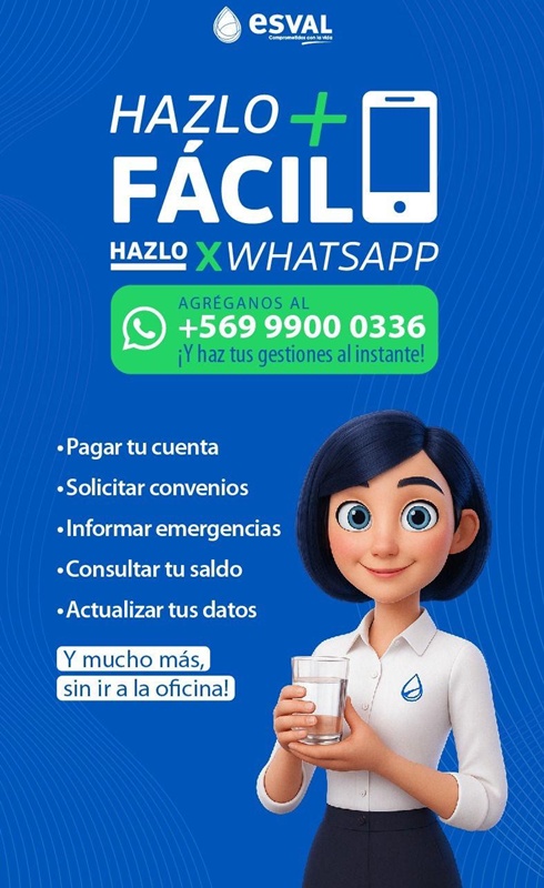 ACONCAGUA (05/11/2205).- En el marco de su compromiso con la mejora continua en la atención a sus clientes, Esval anunció la incorporación de nuevas funcionalidades a su canal de atención por WhatsApp, disponible en el número +56 9 9900 0336.