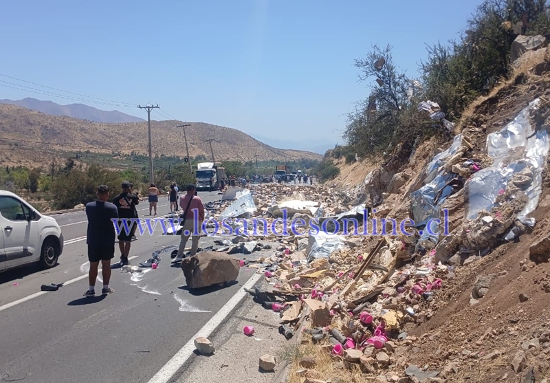 De acuerdo a los antecedentes preliminares obtenidos por Los Andes Online, el accidente se registró pasadas las 14:10 horas a la altura del kilómetro 55, cuando un camión ¾ cargado con artículos de aseo que hacía ingreso al valle de Aconcagua perdió el control y se fue hacia un costado chocando contra la ladera del cerro.