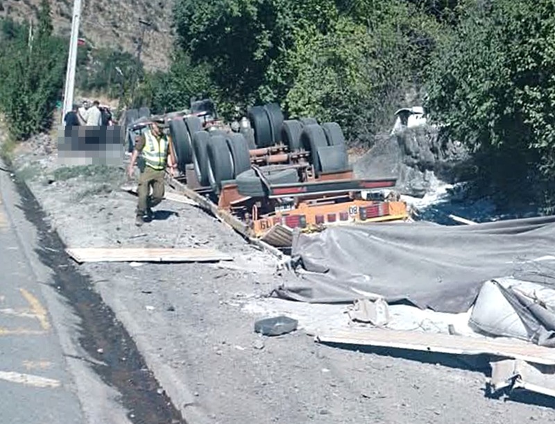 El accidente se produjo a eso de las 10:45 horas del martes, cuando el camión cargado con 27 mil kilos de azúcar a granel se desplazaba en dirección a Los Andes y al enfrentar una curva ubicada cerca de la Escuela de Montaña perdió el control y volcó a un costado.
